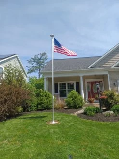 Two-piece silver aluminum flagpole with eagle top. We recommend using the Neverfurl kit to attach your header and grommet flag. This pole is best used in limited duration or in a protected area as it is not as strong as a single piece or 1″ diameter pole. Brackets sold separately.