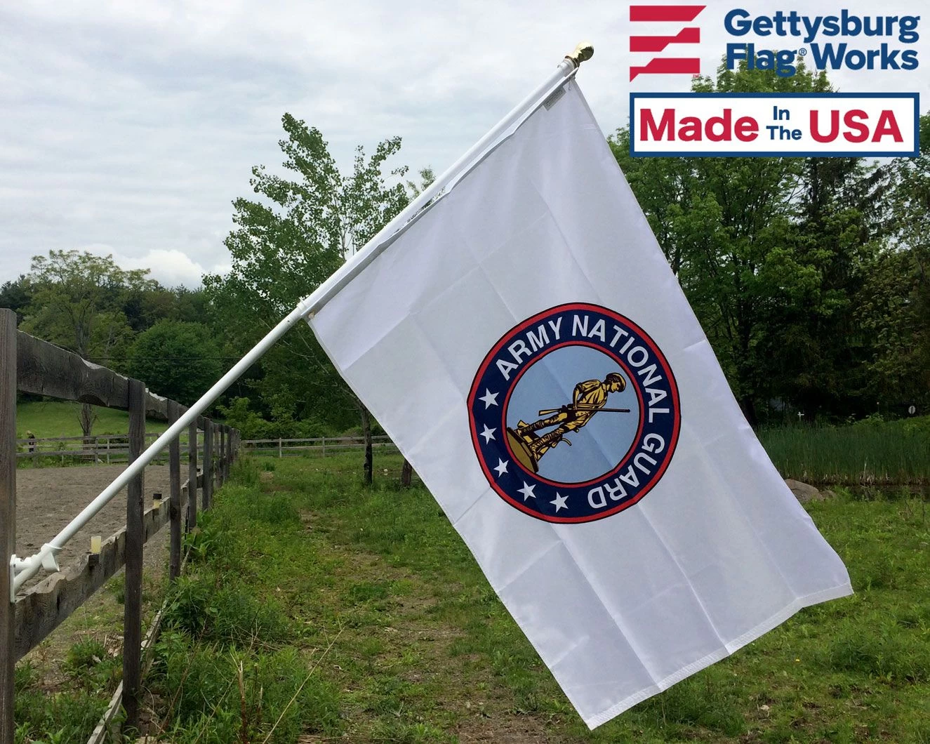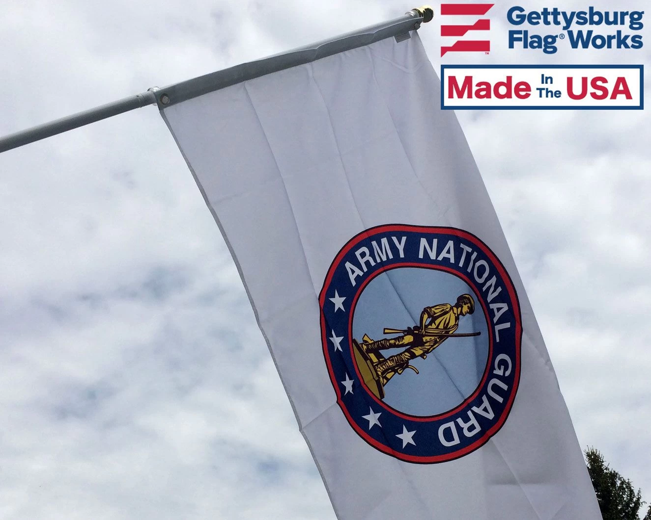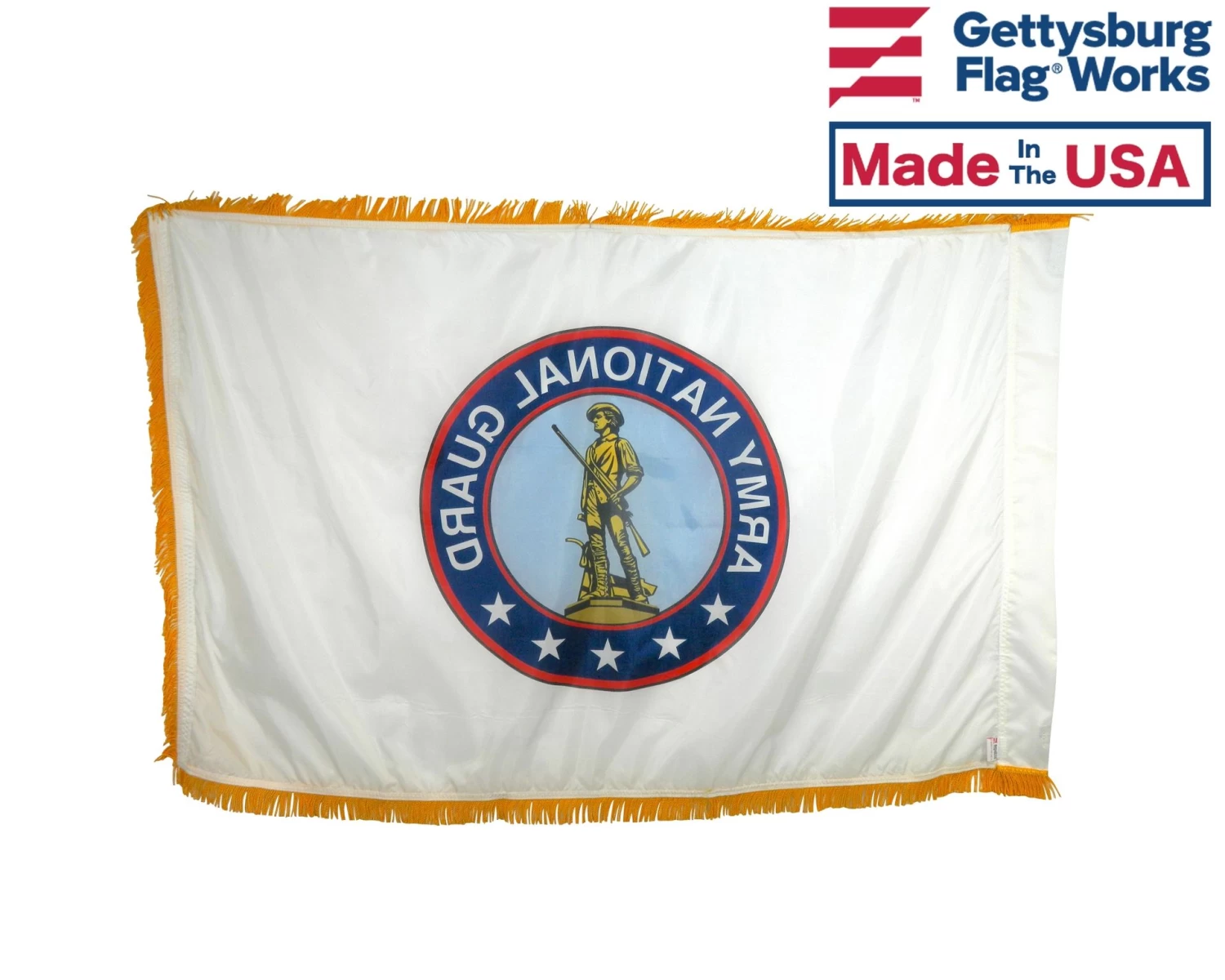 Army National Guard Flag for indoor and outdoor presentation, proudly Made in USA. This design features the iconic minuteman and is surrounded by red ring.
