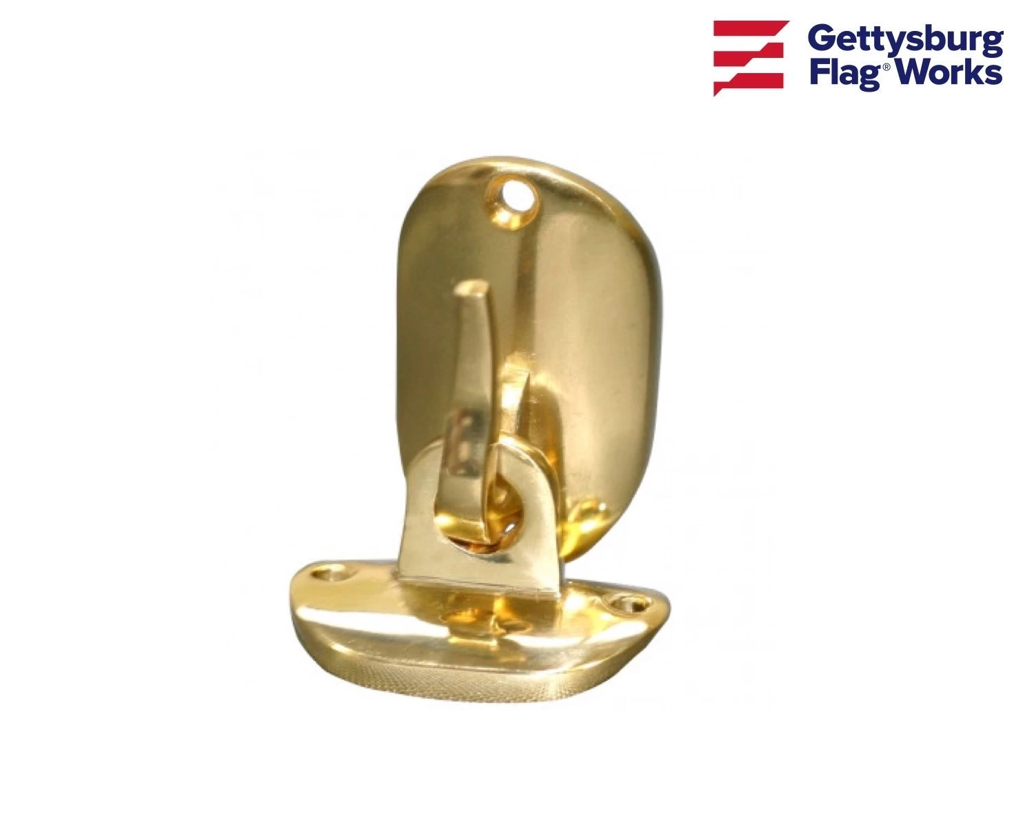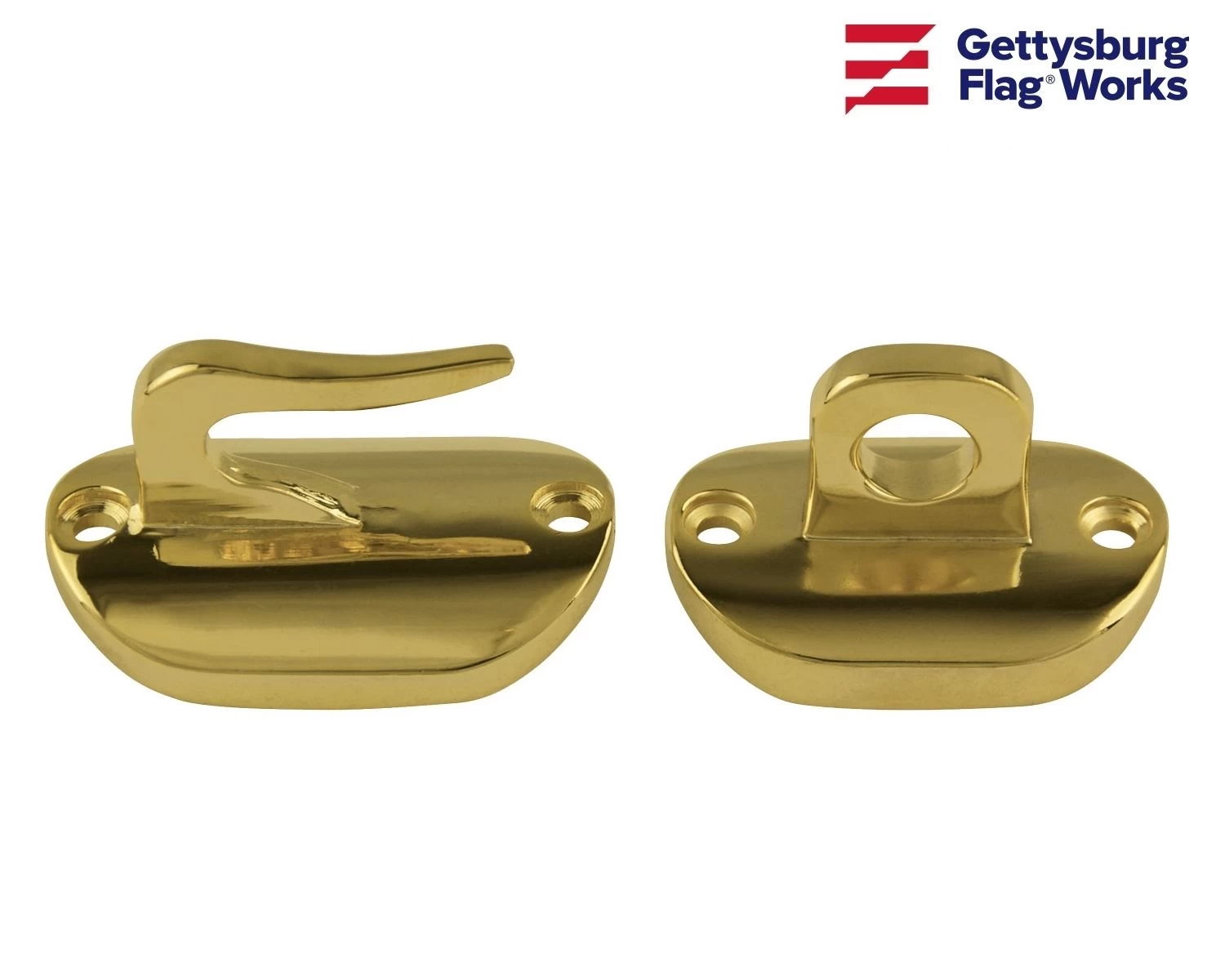 Two-piece Brass hook and eye mounting set, commonly used for mounting a crossbar onto an oak or aluminum pole. Screws included.
