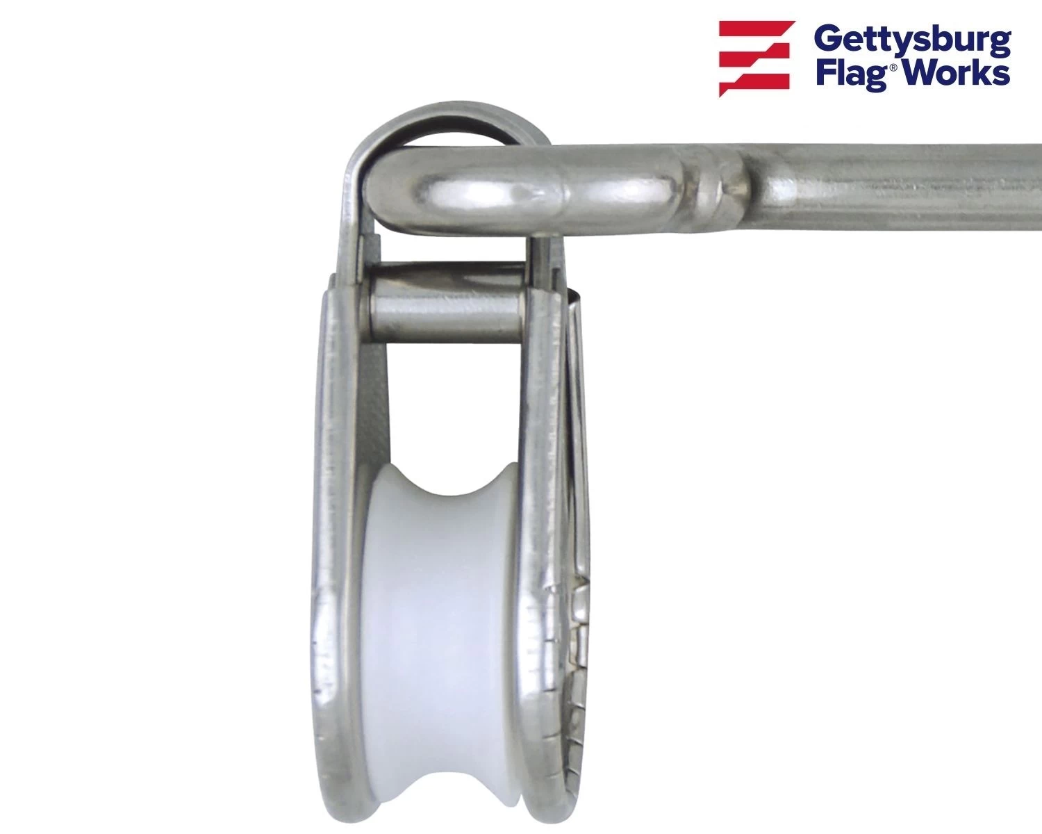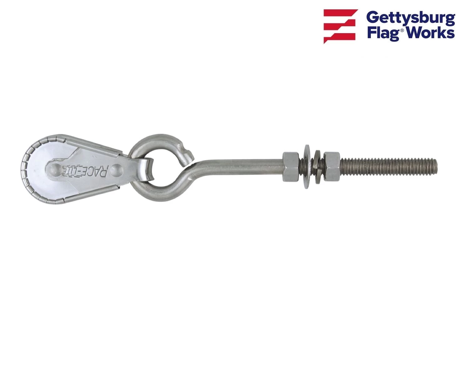 Pulley and eyebolt assembly for replacement or retrofitting flagpole with halyard system.