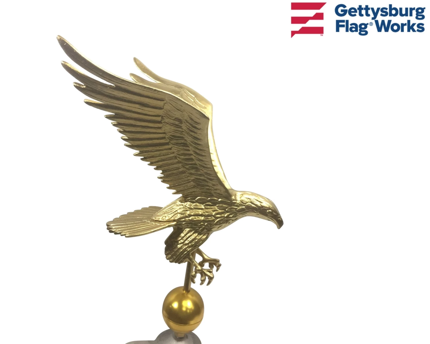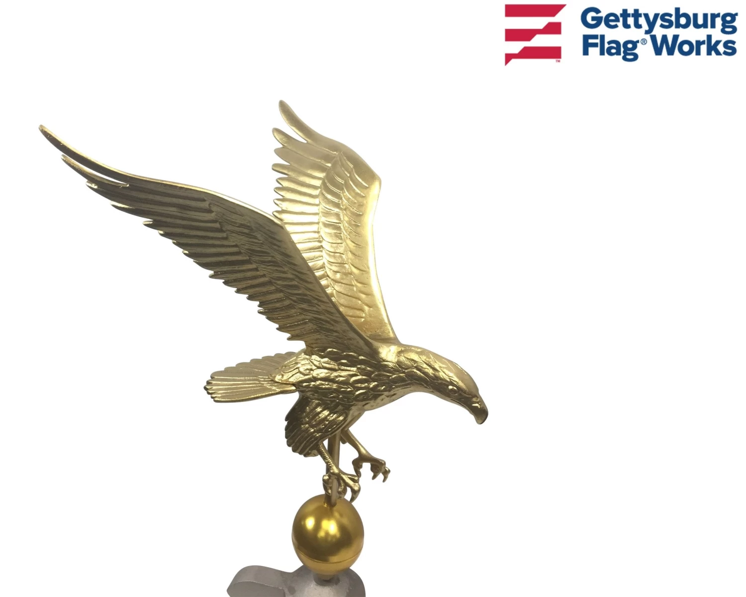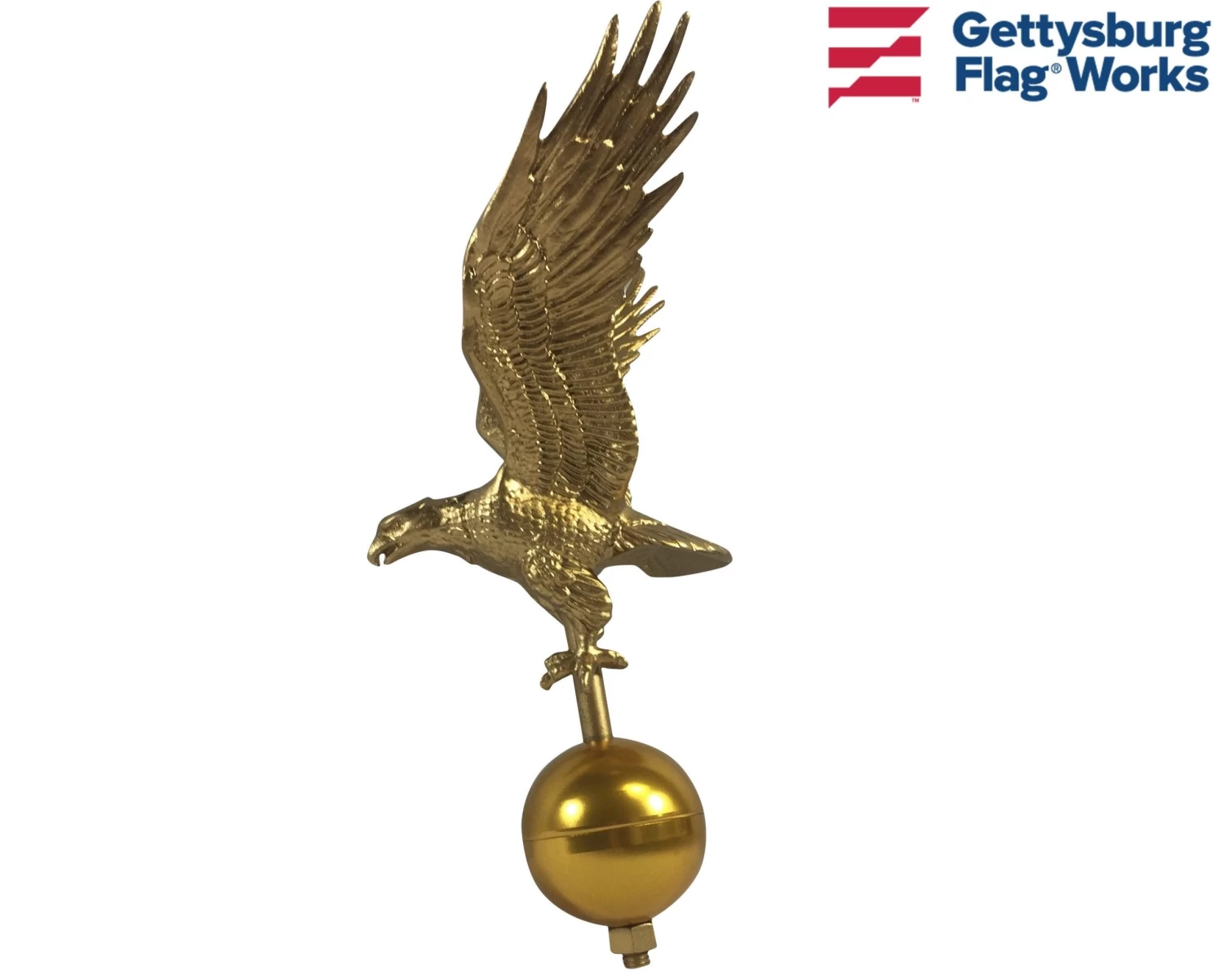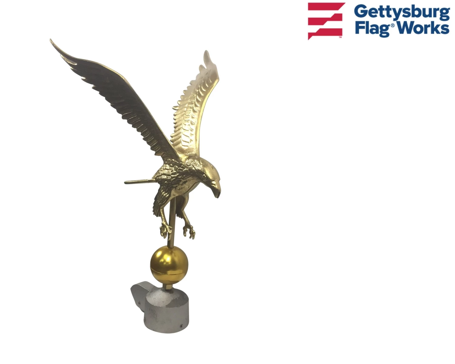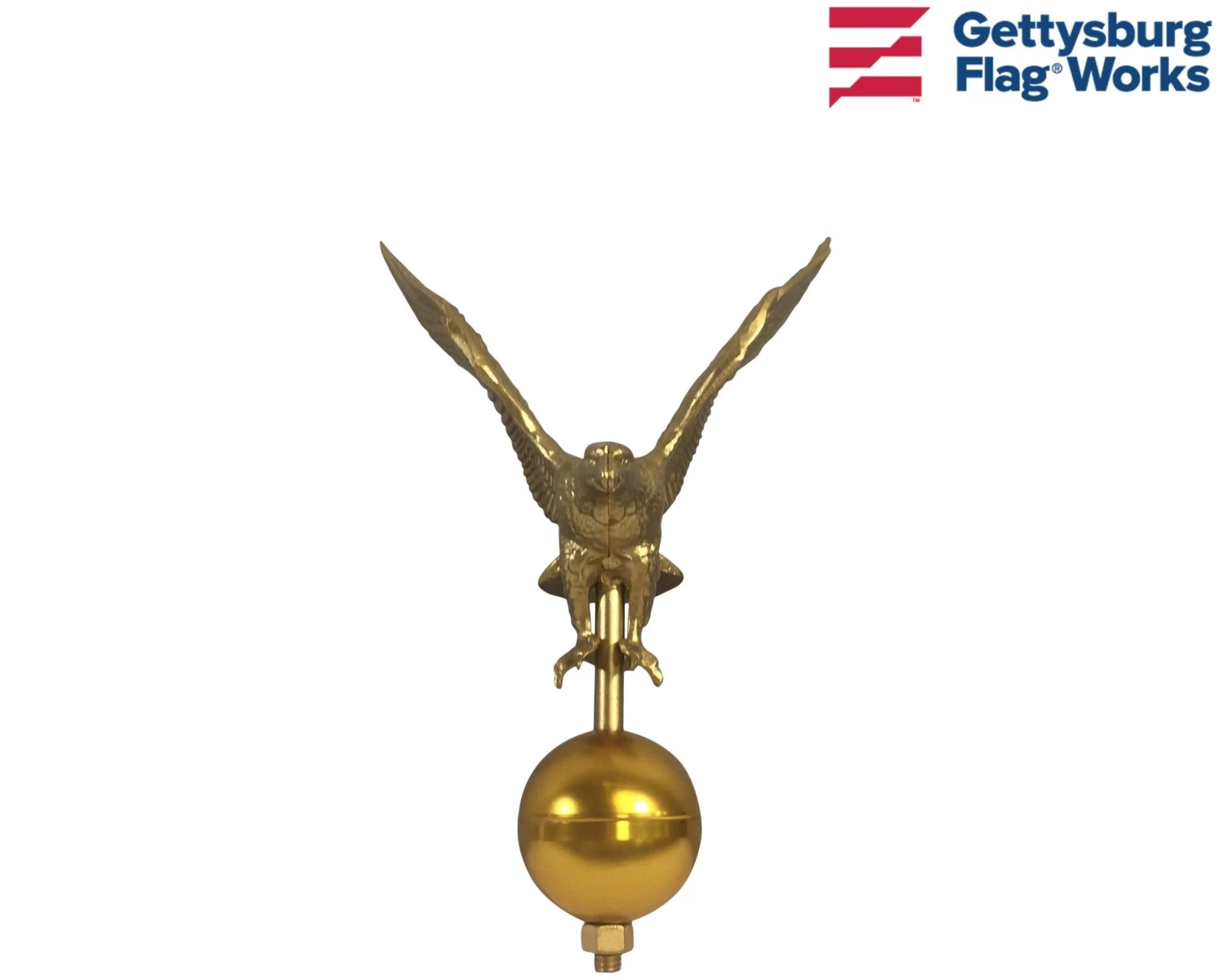 Flying eagle with approximate wingspan listed for sizing. Spindle crews into standard flagpole truck opening. Eagle is perched above ball as shown