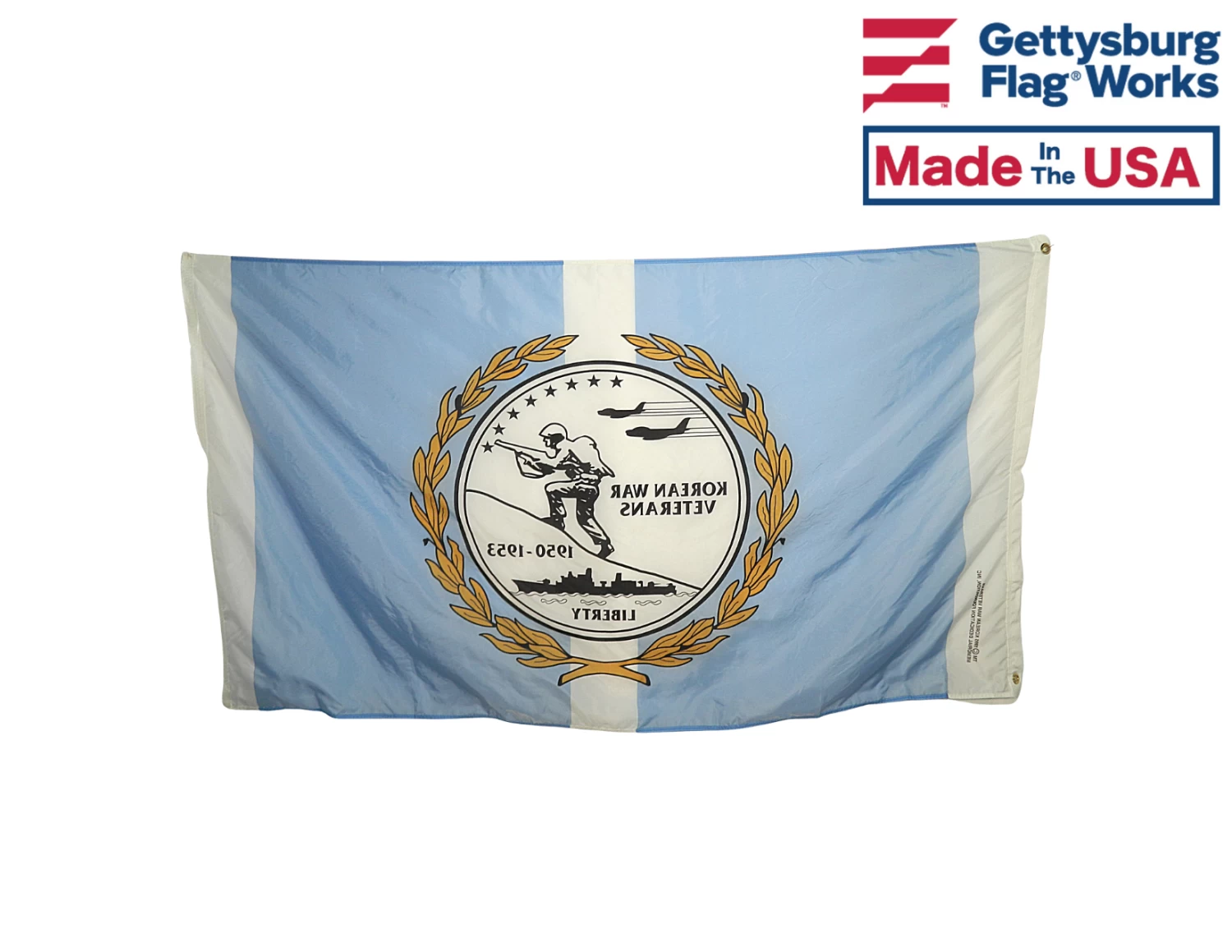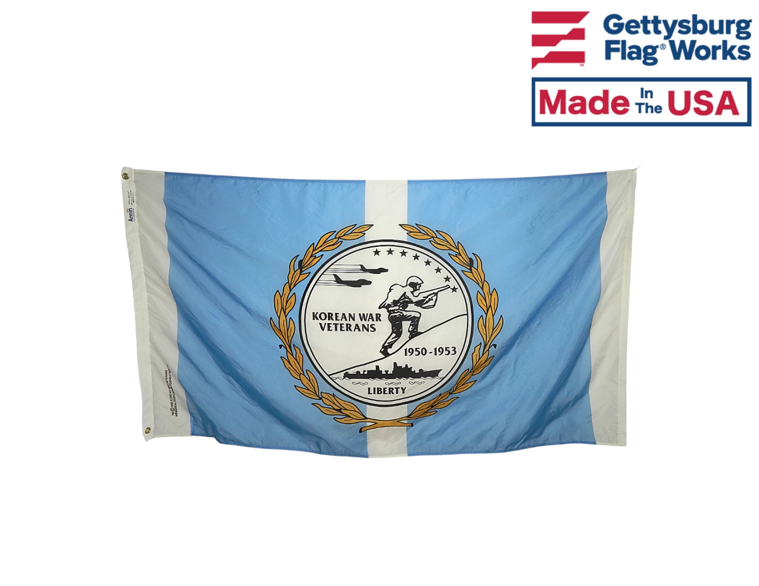 A flag designed as a tribute to Korean War Veterans. Flag is a durable printed nylon for indoor or outdoor display.