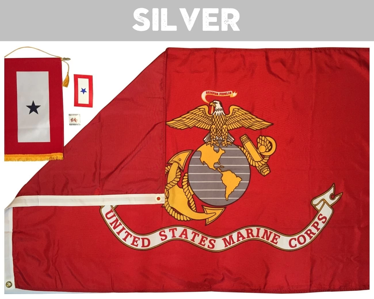 - SILVER includes: 3×5′ Marine Corps flag, service star banner & sticker, and a USMC crossed flags lapel pin