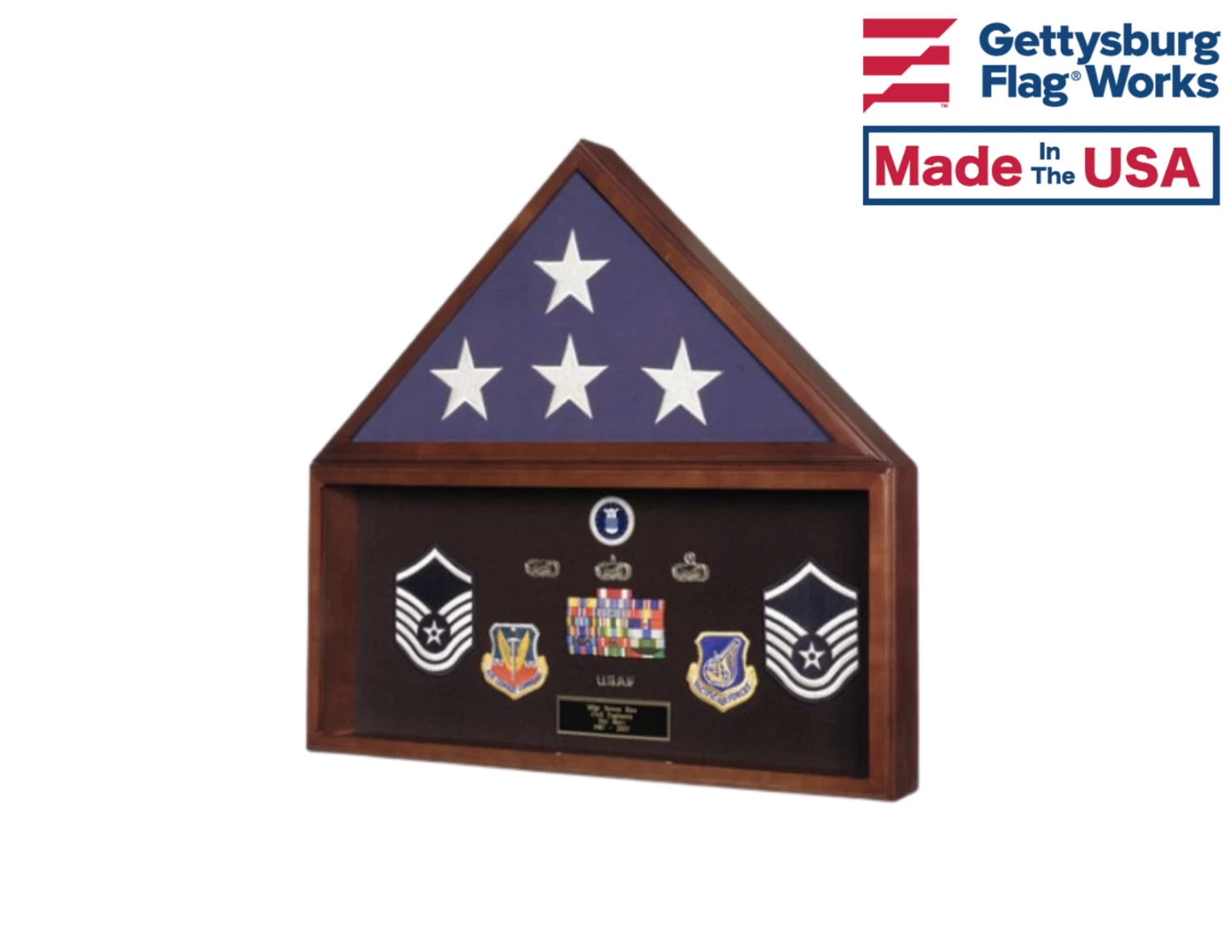 - Create a perfect display for your 5′ x 9 1/2′ flag and accompanying awards or medals.
