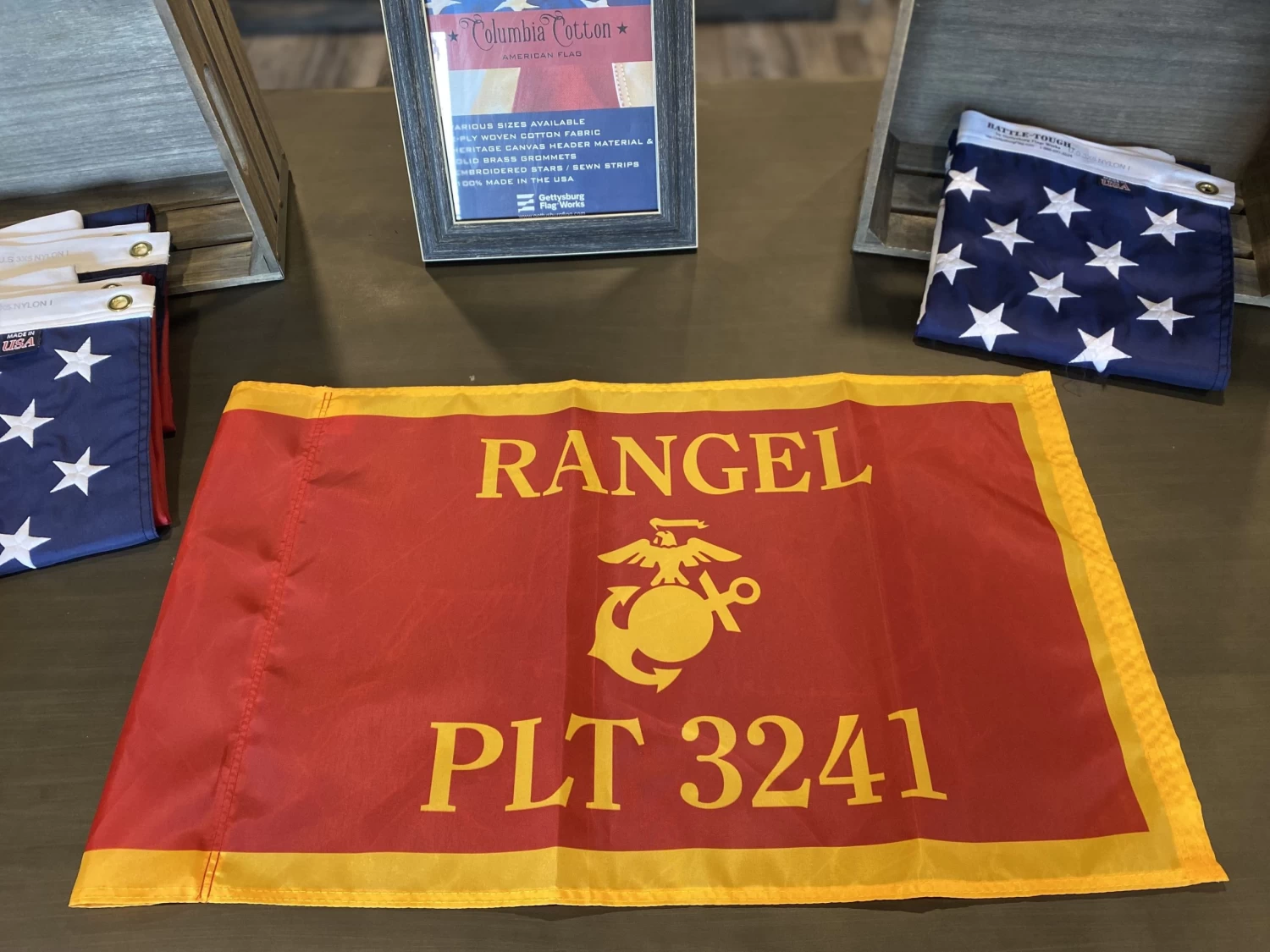 What better way to show pride in your new Marine than recognizing him/her on a flag. These high quality, customized flags will get the job done-at graduation and then can be displayed at home, for years to come. It only take a few steps – insert your new Marines name and platoon number and show your pride.