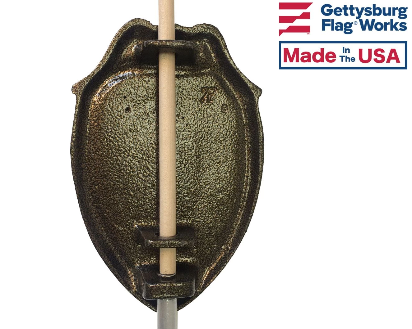 Grave marker for police officers. Law enforcement shield designs. Mounted on 21″ brass rod, holds one 12×18″ stick flag on a 3/8″ staff. Choose between cast bronze or bronze-finished aluminum.