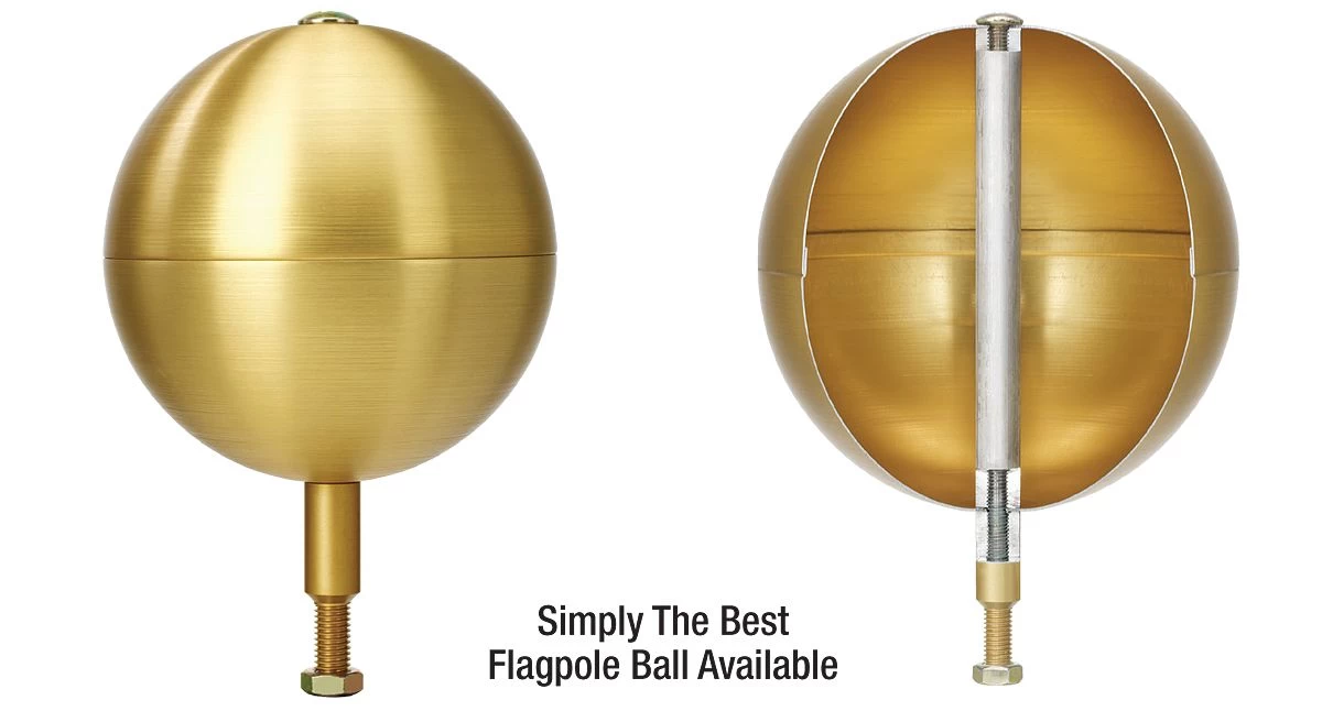Premium Flagpole Ball finial, Made in USA. These heavy-duty balls are made with a much thicker wall aluminum and feature a durable stainless thru-rod that securely screws the ball together. All are supplied mounted to a spindle which screw into the truck or cap at the top of your flagpole. Typically, we recommend that your ball diameter be the same as the largest, or base, diameter of your flagpole.