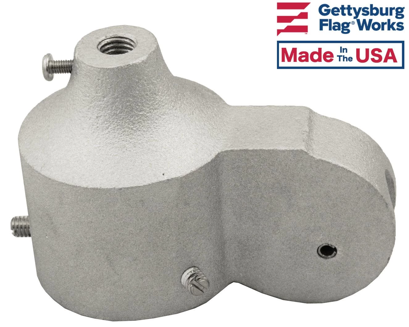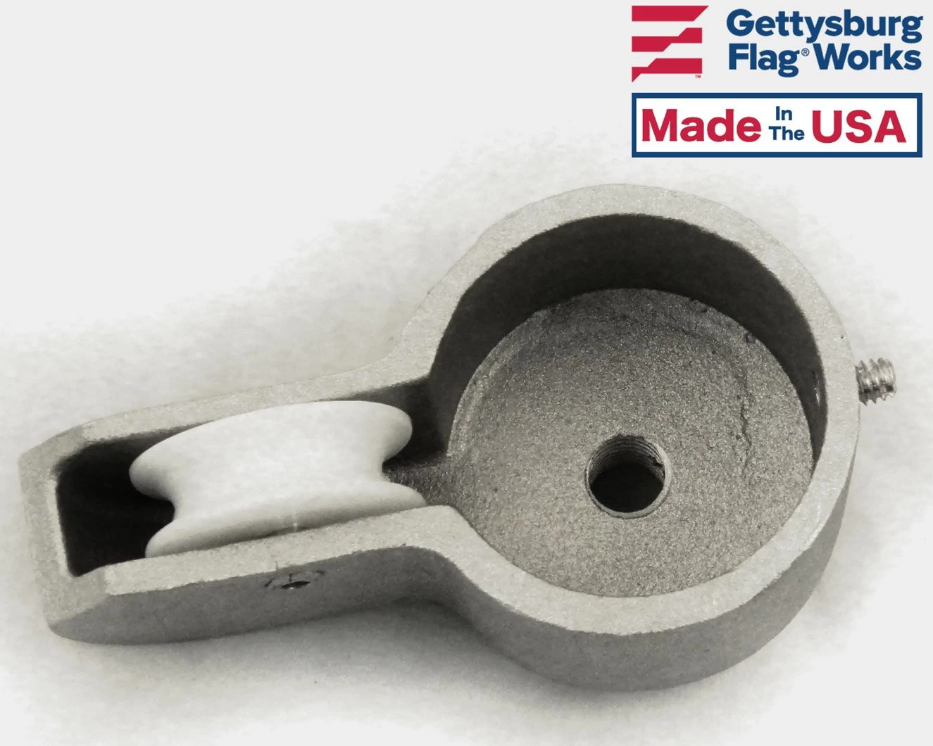 A flagpole truck for external halyard poles, cap style, stationary, single pulley.