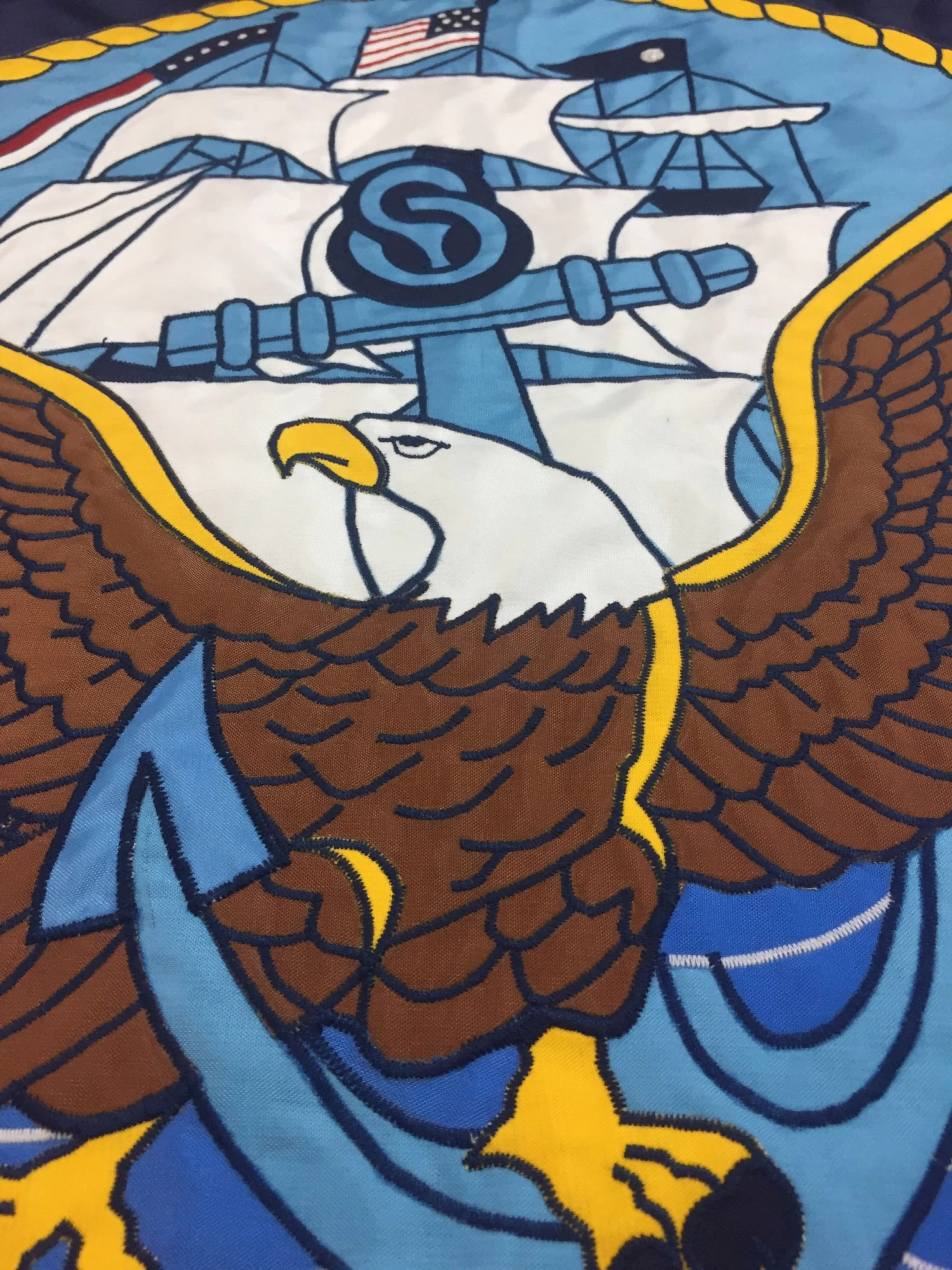 This flag is impressive, with layered designs cut and stitched in beautiful Nylon fabric. The lettering and service insignias are individually cut and stitched onto the base layers of fabric. The attention to detail on these fully stitched flags lends an air of formality and superior presentation to any event, meeting or ceremony.