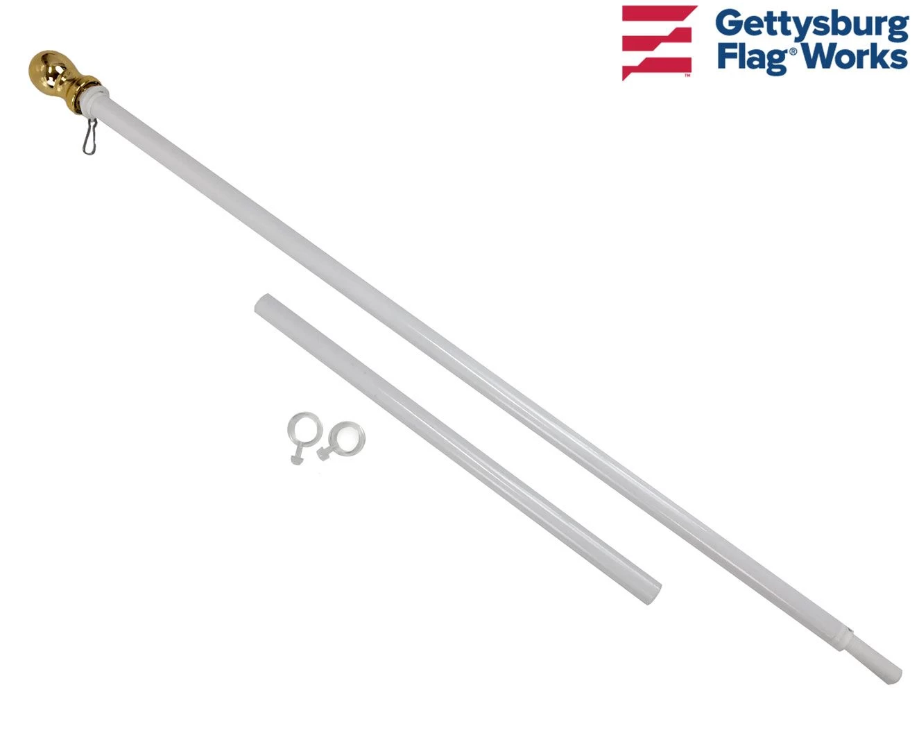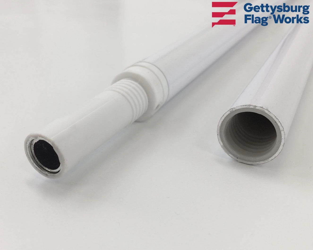 2 piece 6′ White Aluminum Rotating Pole with Steel ball bearings. Will not allow flags to wrap around Pole for more than 2 gusts of wind. Pole will not need maintenance for years to come.